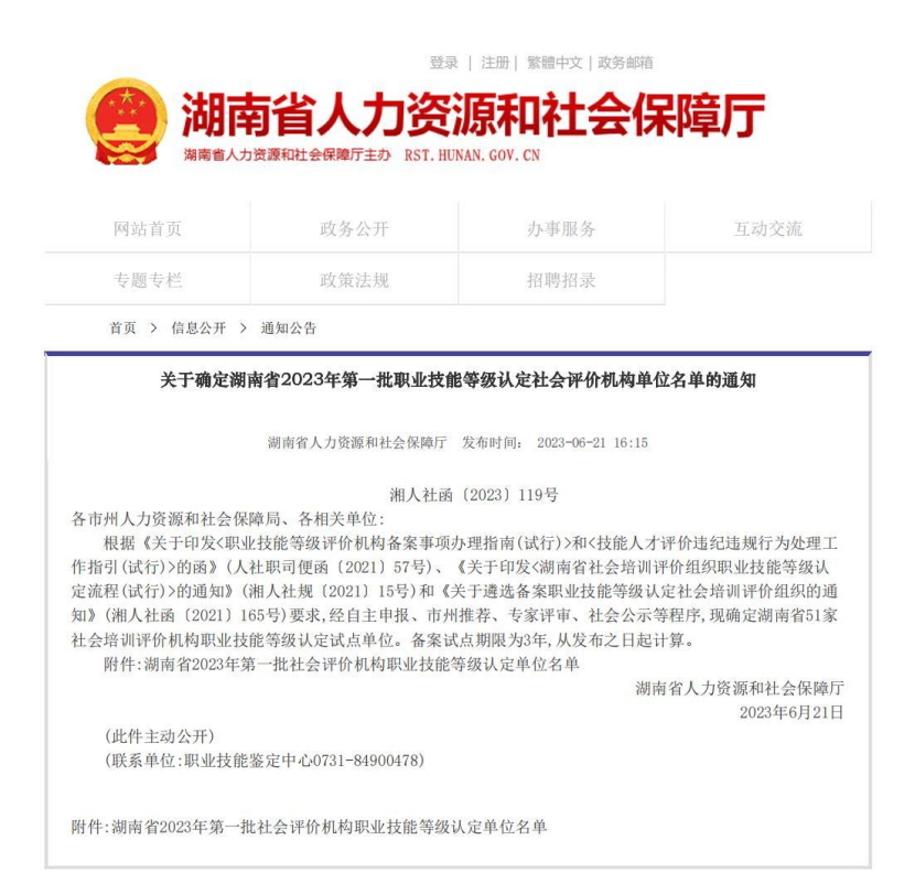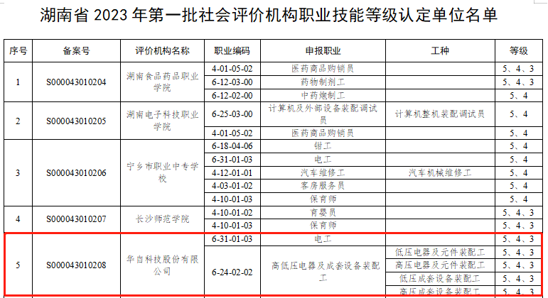 近日,湖南省人力资源和社会保障厅印发《关于确定湖南省2023年第一批职业技能等级认定社会评价机构单位名单的通知》,MK体育官方网站等51家单位经专家评审确定具备职业技能等级认定社会评价资格。公司职业技能工作再上新台阶,可面向社会开展指定职业(工种)职业技能等级认定工作。
