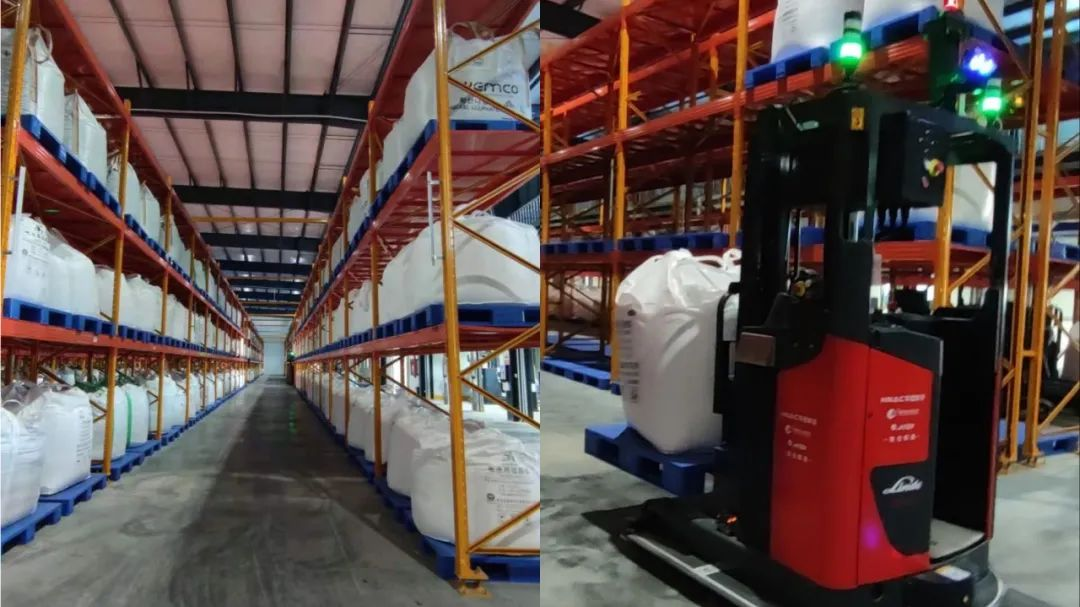 在某新能源企业原材料存储、配料溶解车间,公司量身定制的智能立体仓储系统得到充分应用。项目仓储净空高10m,库位近5000个,工程主体为1批以堆高式AGV为存取设备的自动化立体仓储系统及配套设施设备。
