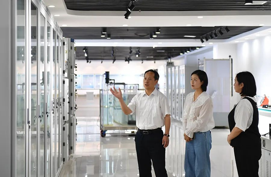 黄文宝(左)向记者介绍公司电力自动化相关产品。