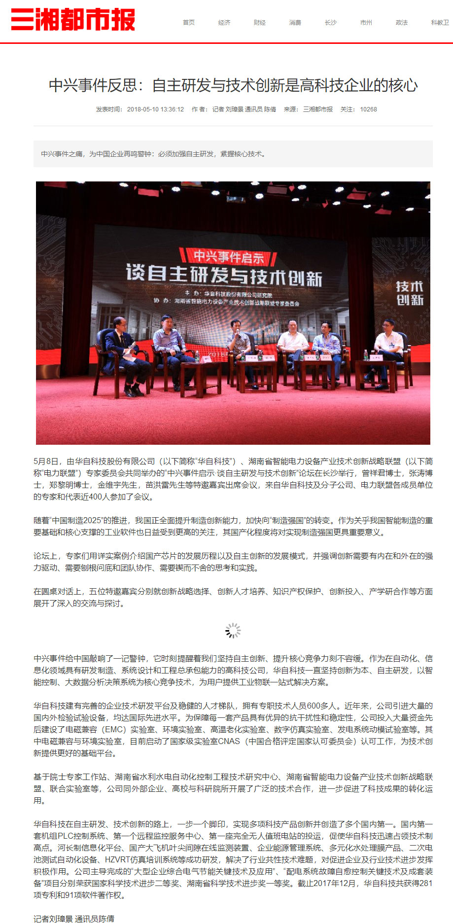 5月8日,由MK体育官方网站(以下简称“MK体育官方网站”)、湖南省智能电力设备产业技术创新战略联盟(以下简称“电力联盟”)专家委员会共同举办的“中兴事件启示·谈自主研发与技术创新”论坛在长沙举行,曾祥君博士,张涛博士,郑黎明博士,金维宇先生,苗洪雷先生等特邀嘉宾出席会议,来自MK体育官方网站及分子公司、电力联盟各成员单位的专家和代表近400人参加了会议。
