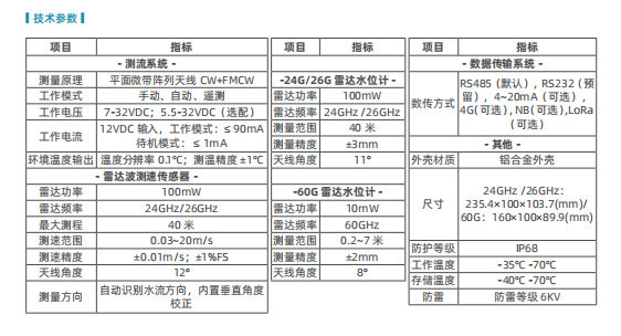 Ø非接触式测量,结合断面参数计算流量,不受风、温度、雾霾、泥沙、漂浮物等影响。具备防雨模式;